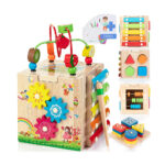 - 【8 in 1 Toddler Activity Cube】This interactive toy allows your kids to play 8 games in 1 toy: bead maze, baby xylophone, learning clock, shape sorter, abacus, spinning gears, sorting & stacking blocks, word cards. The multi-functional baby activity cube toy will attract their attention for hours as they will rotate from one side to another