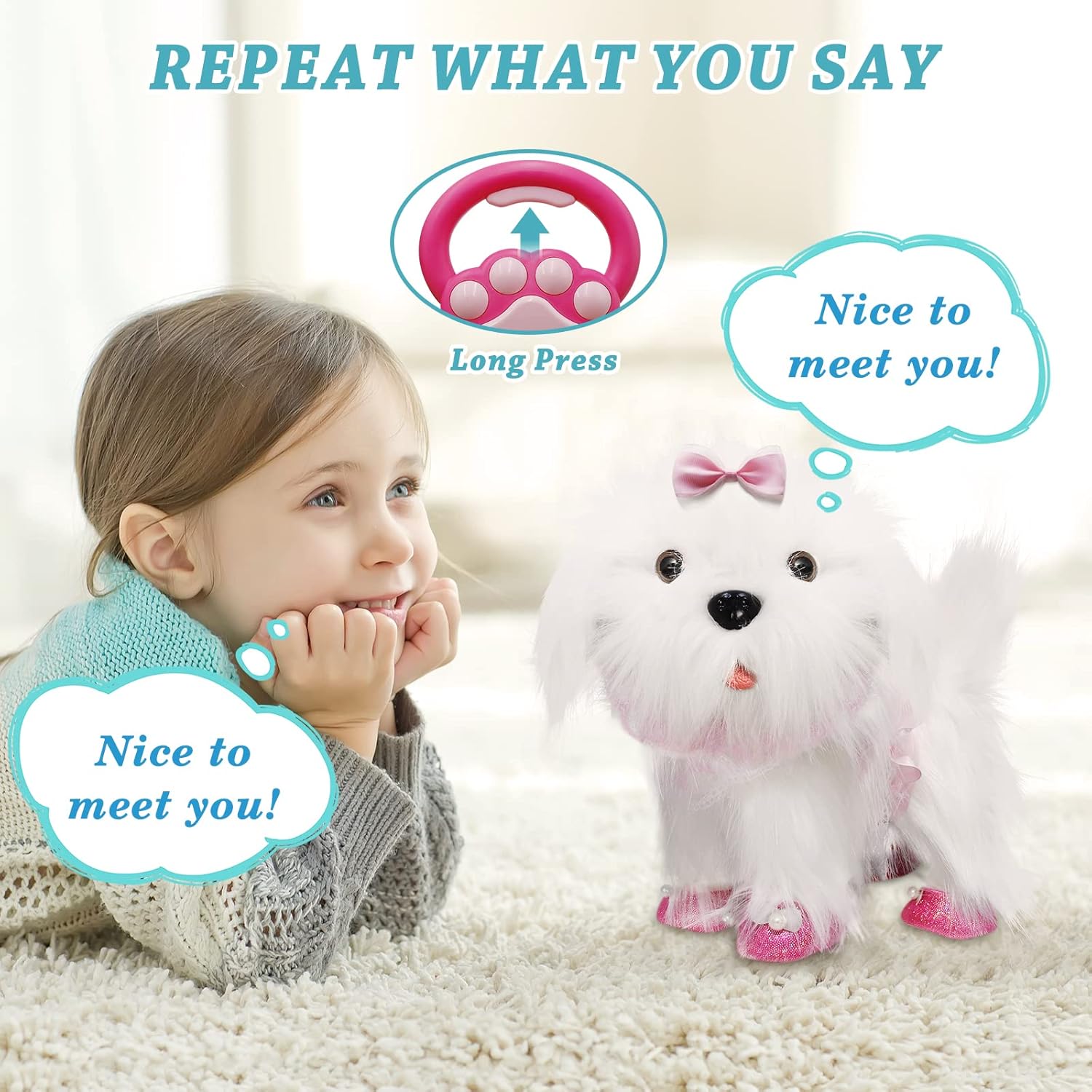 • 【 Lick & bark 】We innovatively added the tongue-licking function. This is something other toy dogs don’t have. After gently touching the head or slapping the palm on the head, the toy dog can lick your hand or lick your leg gently. It is very similar to the experience of a real dog licking its tongue; It is equipped with five kinds of barking sounds, including the common “wang, wang” “ao~ao~” “woof, woof” and the tongue-sticking voice “hahaha” and the coquetry-voice “ao~wang wang”