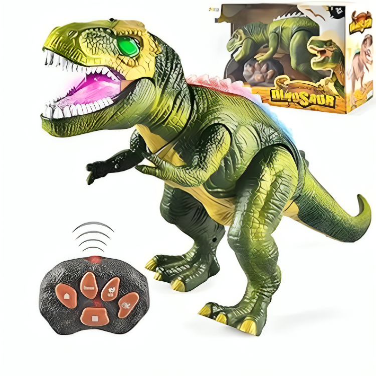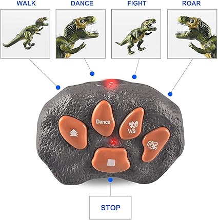 • Feathering Stunning LED Light, Remote Control Walking & Shake Head with Roar Sound. LED lights in Red, Blue and Green Illuminate the Clear Spikes Down the Back and Flash the Eyes & Tongue.
