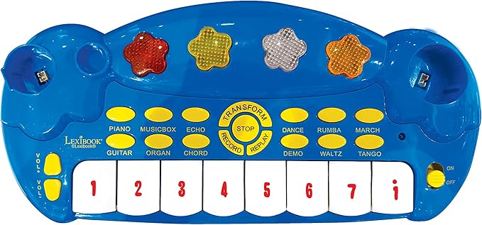 - An 8-keys keyboard with 4 types of musical instruments, 4 rhythms and 8 demo songs to play while having fun!
